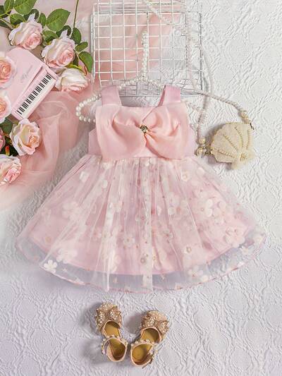 Baby Girl Elegant Mesh Splice Dress With Bow Decoration-51%