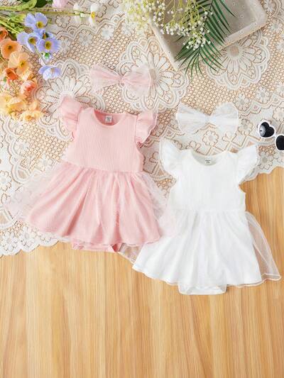 Baby Girls' Leisure Knitted Plain Mesh Panel Open Crotch Bodysuit With Headband 4pcs Set-50%