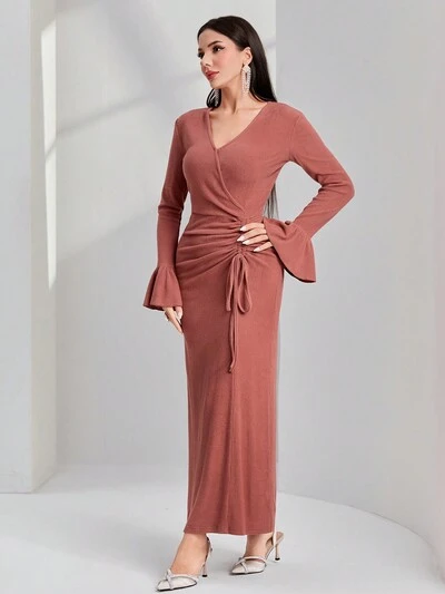 Pink Ruffle Sleeve Drawstring Waist Dress-60%