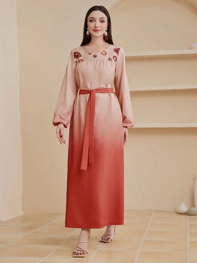 Women's Square Neckline Lantern Sleeve Color Block Trimmed Belted Dress With Arabesque Pattern Long Evening Dresses