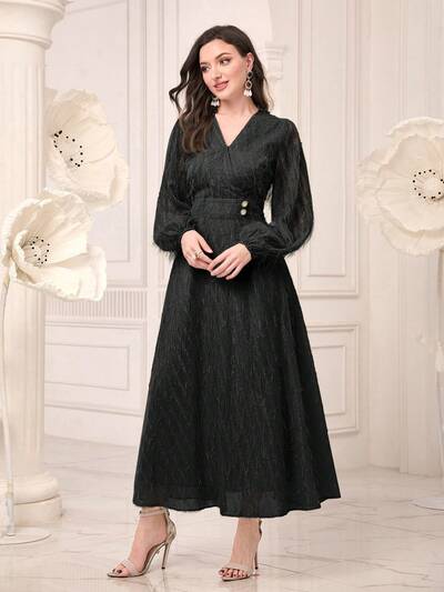 Women's Puff Long Sleeve Dress With Turn-Down Collar,Elegant Evening Party Dress Long Evening Dresses-60%