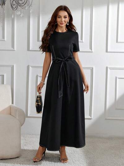 Women's Short Sleeve Arabic Style Color Blocked Stitching Dress Long Evening Dresses-60%