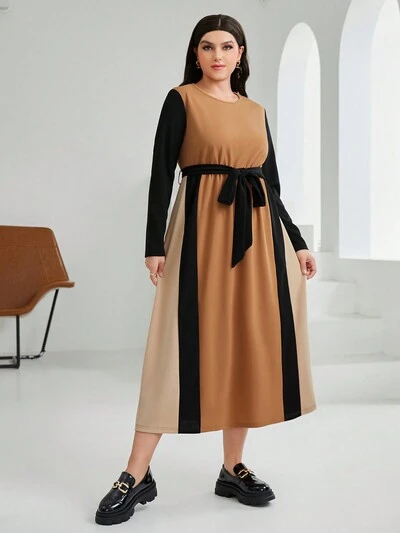 Plus Size Women's Color Blocking Arabian Belted Dress-60%