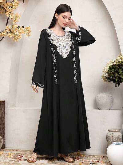 Plus Size Women's Embroidered Waist Cinching Arab Dress Kaftan Jalabiya Dress