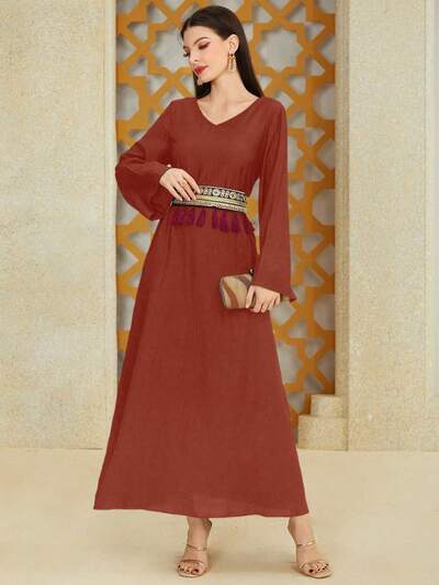 Fashionable Arab Style Round Neck Fringed Cinching Waist Ruffled Hem Dress Long Evening Dresses