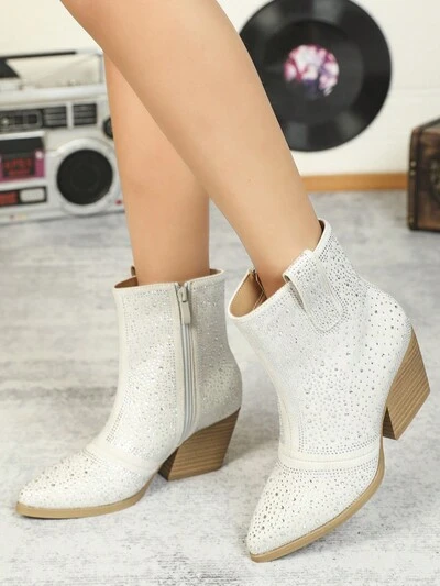 White Short Boots With Rhinestone & 3d Rhinestone Decoration, Zipper Closure, Pointed Toe, Fashionable Women Boots, New Arrival