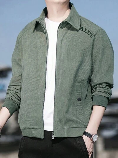 Men's Loose Fit Corduroy Jacket With Letter Embroidery And Zipper Closure-60%