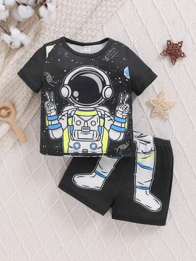 Baby Boys' Astronaut Pattern Round Neck Short Sleeve T-Shirt And Casual Shorts Set-60%