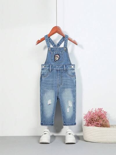 Baby Boy 1pc Bear Patched Detail Ripped Denim Overalls-60%