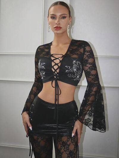 Rhinestone Detail Lace Up Front Flounce Sleeve Crop Top-65%