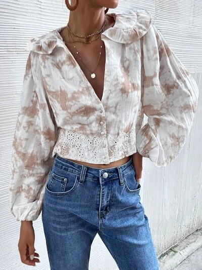Plunging Neck Eyelet Embroidery Tie Dye Blouse Fall Cloth For Women-32%