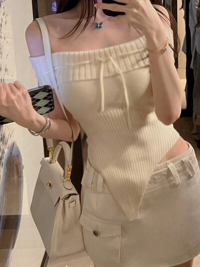 Women Summer Casual Ribbed Knit Cropped Tank Top And Sweater Skirt-25%