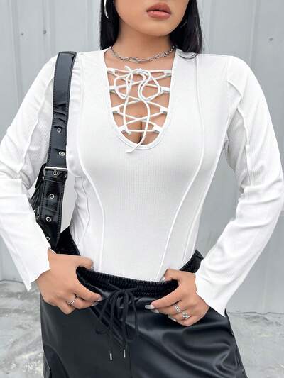 Plus Size V-Neckline Strappy Sleeveless Bodysuit With Stitch Details-25%