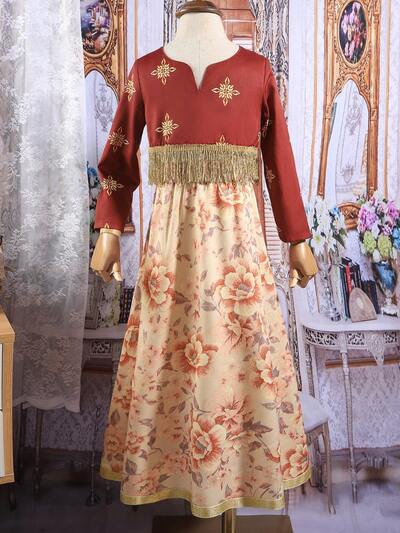Young Girl 2pcs/Set Long Sleeve Top & Vintage Flower Printed Long Skirt With Golden Tassel Hem, Daily Wear-47%