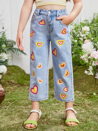 Young Girls' Y2k Style Comfortable Elastic Waistband Loose Straight Leg Jeans With Color Blocking Heart Print And Light Blue Washed Finish-47%