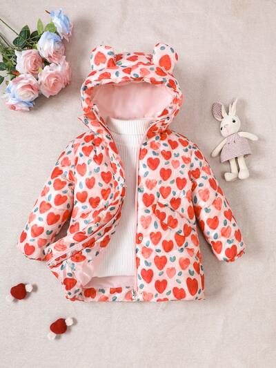 Toddler Girls' Full-print Heart Pattern 3d Ear Hooded Padded Coat-60%