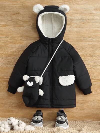 Young Boy Cartoon Bear Decor Plush Lined Hooded Padded Coat-60%