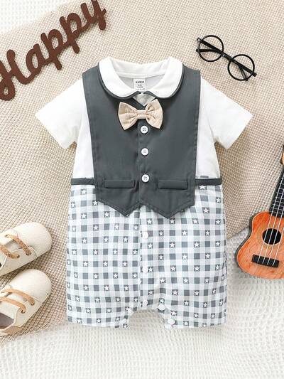 Baby Boy Elegant Academy Style Retro Necktie Collar Plaid Patchwork Short Romper With Vest Gentleman Suit Set, For Spring And Summer Outings-50%