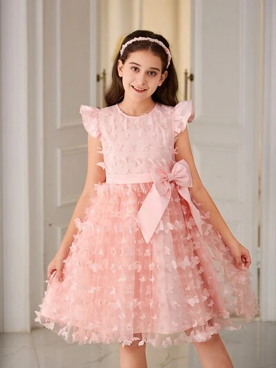 Tween Girl Gorgeous Spring Summer Mesh Applique Round Neck Cap Sleeve Dress With Bow Decor-48%