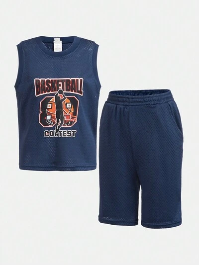 Tween Boy Breathable Mesh Fabric Basketball Printed Sportswear Suit, Suitable For Outdoor Sports, Fitness, Aerobics-60%