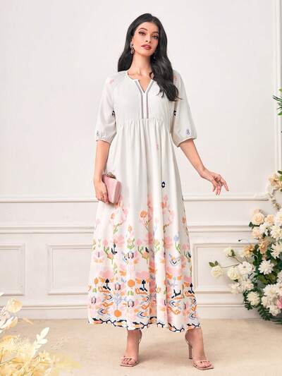 Striped & Floral Print Notch Neck Tunic Dress, Modest Kaftan-64%