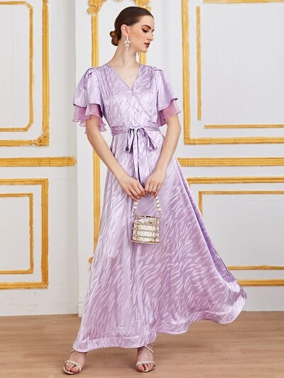 Butterfly Sleeve Self Belted Jacquard Dress-64%