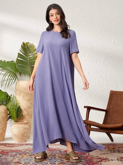 Women's Round Neck Short Sleeve Asymmetrical Hem Dress-65%