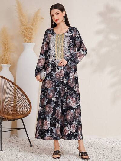 Women's Floral Printed Heat-Pressed Rhinestone & Embroidery Decor Round Neck Dress-65%