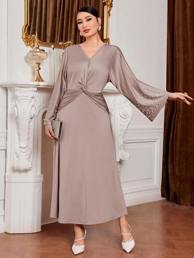 Twist Front Pearls Beaded Trumpet Sleeve Dress-65%