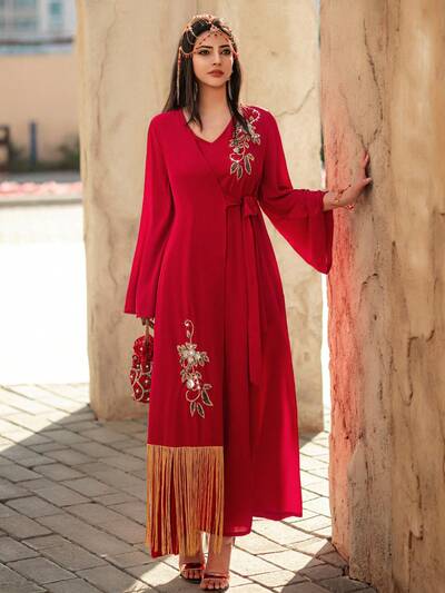 Women's Flared Sleeve Embroidered Fringed Evening Arabian Dress-60%