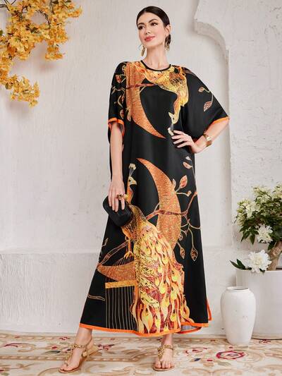 Summer Casual Loose Short Sleeve Peacock Print Dress-65%
