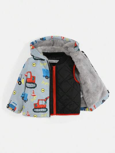 Baby Boy Letter & Car Graphic Hooded Thermal Lined Coat & Vest Jacket-60%