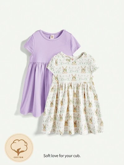 Baby Girl 2pcs/Set Knitted Soft Short Sleeve Round Neckline Dress With Elastic Waist