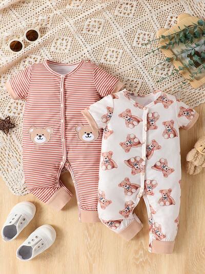 Baby Boys' Simple And Comfortable Cute Bear Striped And Printed Jumpsuit Set-65%
