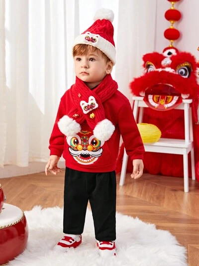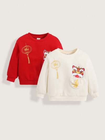 Spring Festival Cartoon Animal Printed Round Neck Drop Shoulder Sweatshirt 2pcs For Baby Boy And Girl-60%