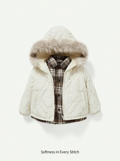 Baby Boy Slant Pocket Fuzzy Trim Hooded Quilted Coat-60%