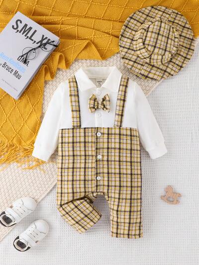 Baby Boys' Plaid Patchwork Jumpsuit With Bowknot Decor, 2 In 1 Style, With Hat-60%