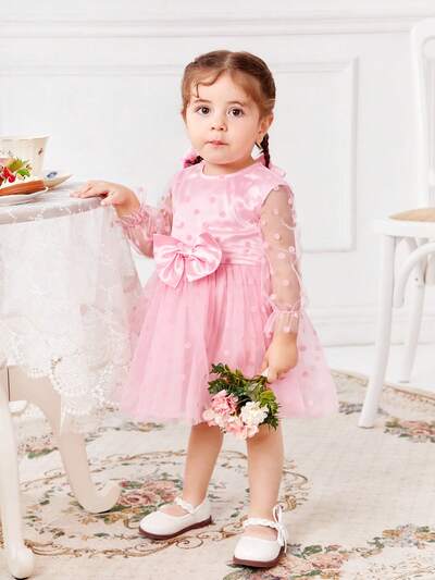 Baby Girls' Elegant Pink Butterfly & Polka Dot Mesh Long Sleeve Dress-43%