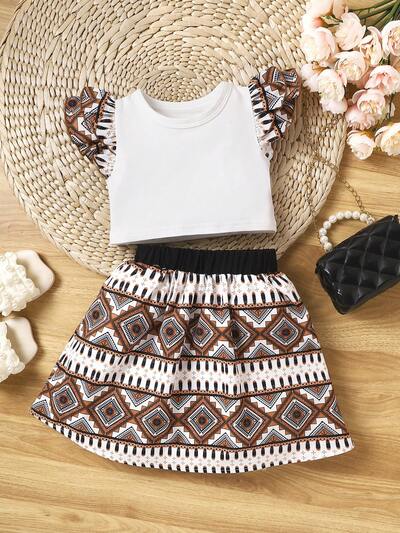 2pcs/Set Baby Girl Lotus Flutter Sleeve Round Neck Elastic Top Geometric & Colorful Pattern Printed Skirt, Gorgeous Fashionable And Comfy, Suitable For Spring Summer-43%
