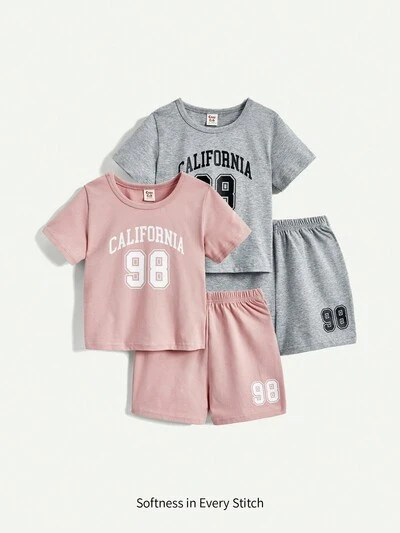 4pcs/Set Baby Girls' Short Sleeve Letter Printed Top & Casual Shorts Outfits Matching Set-50%