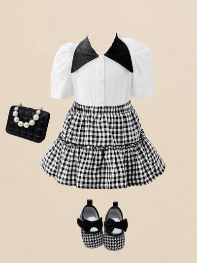 2pcs/Set Baby Girls' Elegant Vintage College Style Color-Block Puff Sleeve Shirt And Plaid Skirt Outfit-42%