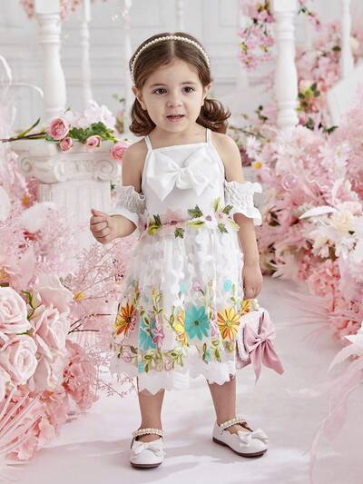 Baby Girl Hollowed Top Bowknot Embellished Embroidered Mesh Dress-53%
