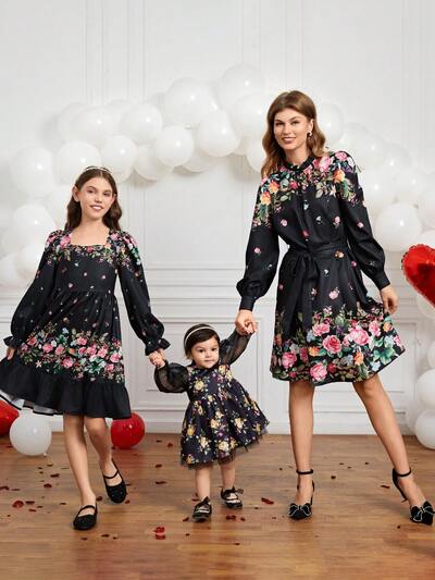 Baby Girl 1pc Floral Print Mehs Lantern Sleeve Dress