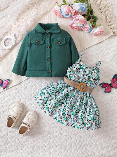 Baby Girl Floral Print Belted Cami Dress & Flap Detail Jacket-60%