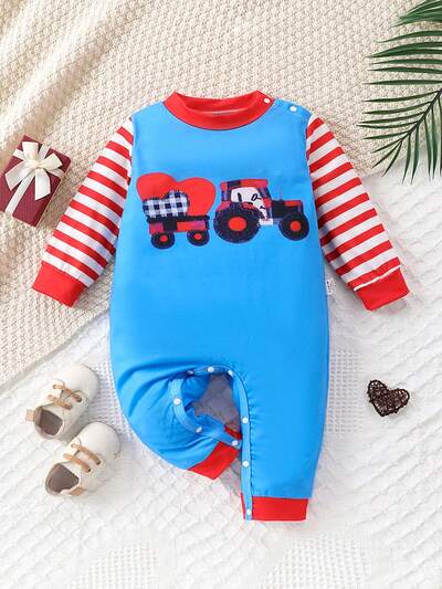 Baby Girl Heart Printed Striped Long Sleeve Jumpsuit With Patchwork For Spring & Autumn