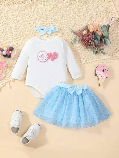 Baby Girl Sweet Donut Applique Bodysuit With Colorful Polka Dot Mesh Skirt And Headband, Cute For Spring/Summer-44%