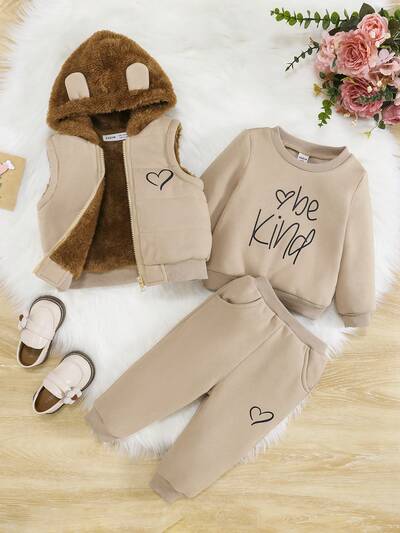 Baby Girl Slogan Graphic Hoodie & Sweatpants & Thermal Lined Vest Jacket