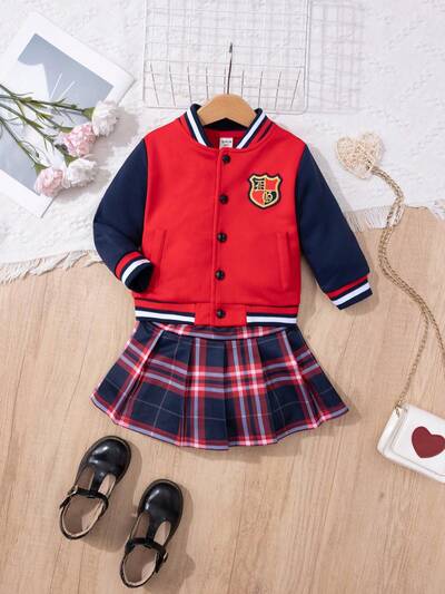 Baby Girls' College Style Baseball Jacket And Plaid Pleated Skirt Outfit-65%