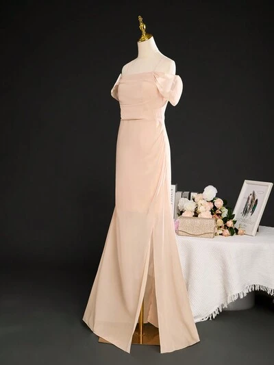 Teen Girl Wedding Season Chiffon Bridesmaid Dress With Ruffle Trim, Off Shoulder And High Slit, For Wedding, Prom, Birthday Party Evening Gown