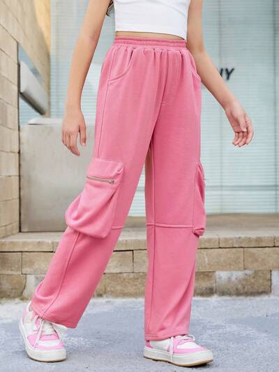 Tween Girls' Casual Streetwear Solid Color Straight Leg Cargo Pants-65%